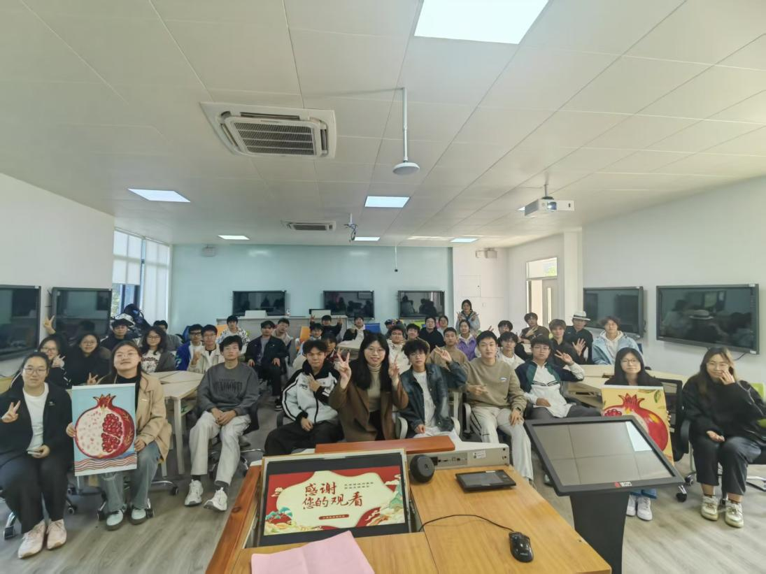 班会结尾,辅导员郑舒琼结合全班共同完成的两幅石榴手印画作点评。她指出这些紧密相连的指印恰如紧紧相依的石榴籽,正是“各民族像石榴籽一样紧紧抱在一起”的生动写照。她鼓励同学们将“我们”真正装进心里,为铸牢中华民族共同体意识,奉献青春力量。