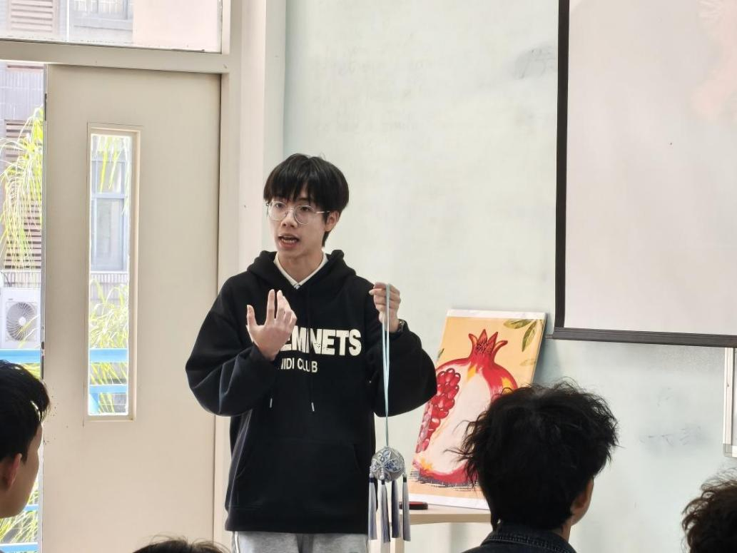 互动环节后,全体同学共同参与“石榴同心手印画”创作。在石榴画板前,同学们依次按下红色手印,生动地诠释了“各民族像石榴籽一样紧紧抱在一起”。