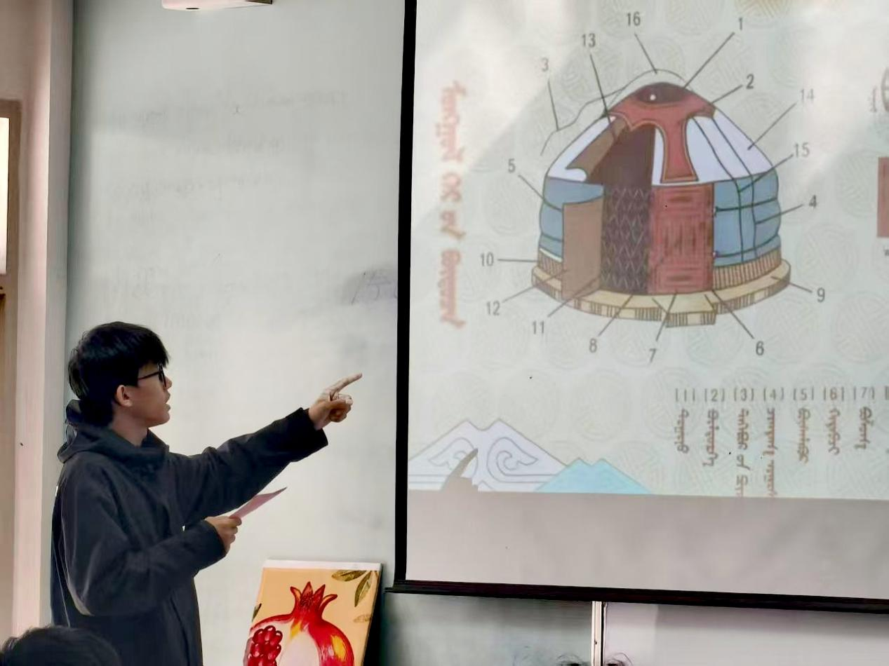 制度的保障搭建了我们相遇的桥梁,而文化的深度交融,真正让我们的心紧密相连。班会上,蒙古族同学一曲悠扬的《山顶》,唱出了草原情怀,壮族同学展示的精美绣球,一针一线绣出了匠心传承,瑶族同学热情的长鼓舞,舞出了民族文化的蓬勃活力。回族同学对服饰与饮食文化的生动讲解,蒙古族同学对蒙古袍的现场展示,更让文化的质感触手可及。文化的共鸣,深化了我们对共同家园的认同。