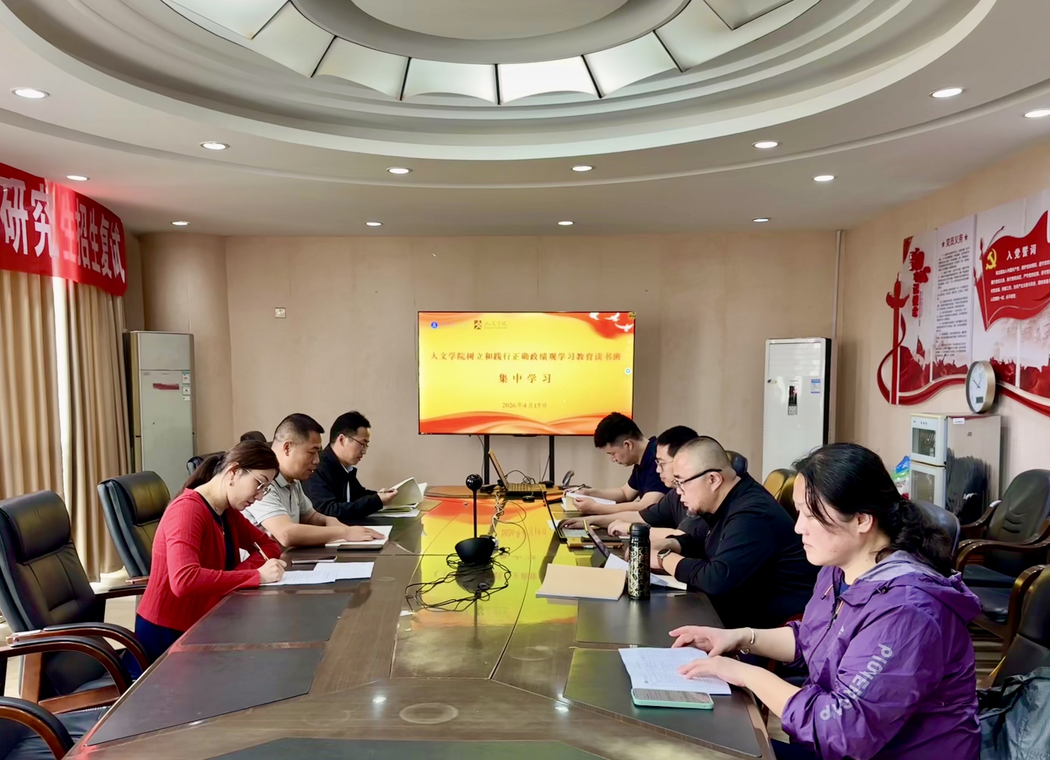 4月15日上午,人文学院领导班子树立和践行正确政绩观学习教育读书班开展集中学习和现场教学。院领导、院长助理、科级干部参加学习。